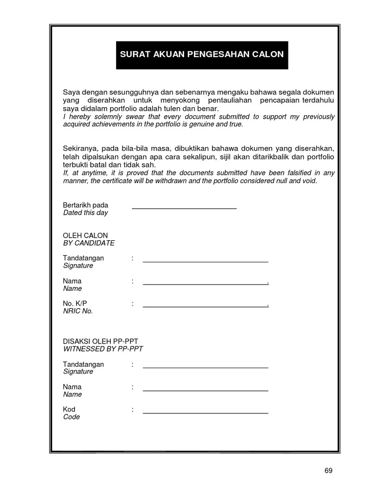 Saya dengan sesungguhnya dan sebenarnya mengaku bahawa segala dokumen yang diserahkan untuk menyokong pentauliahan pencapaian terdahulu saya di dalam adalah tulen dan benar Sekiranya pada bila-bila masa dibuktikan bahwa yang diserahkan telah dipalsukan dengan cara apa sekalipun sijil akan ditarikbalik dan portfolio terbukti batal dan. Surat akuan ini digunakan untuk membuat permohonan-permohonan tertentu terutamanya melibatkan permohonan bantuan.